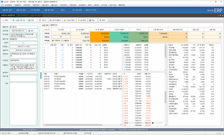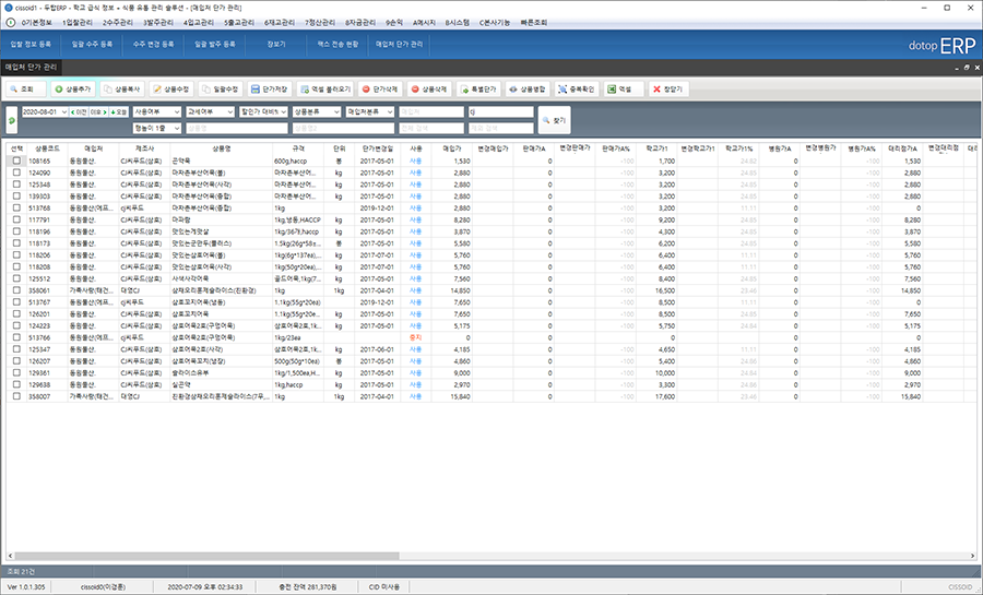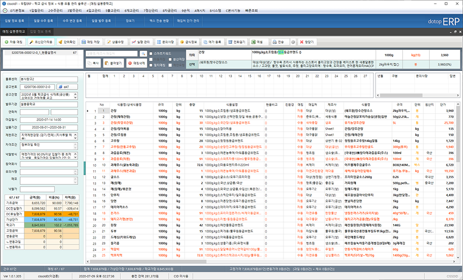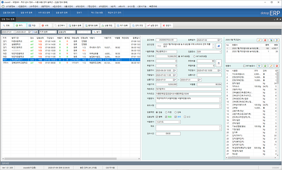 두탑ERP는 식자재 유통 관리에 최적화된 프로그램으로 식품 유통에 필요한 모든 기능을 망라하고 있습니다. 식자재 유통에 필요한 수주, 발주, 입고, 출고에서 재고, 정산 기능으로 안전하게 학교 급식 납품을 도와줍니다. 그밖에도 각종 통계 자료와 팩스, 이메일 전송 및 SMS 메시지 전송도 가능한 토탈 솔루션입니다.