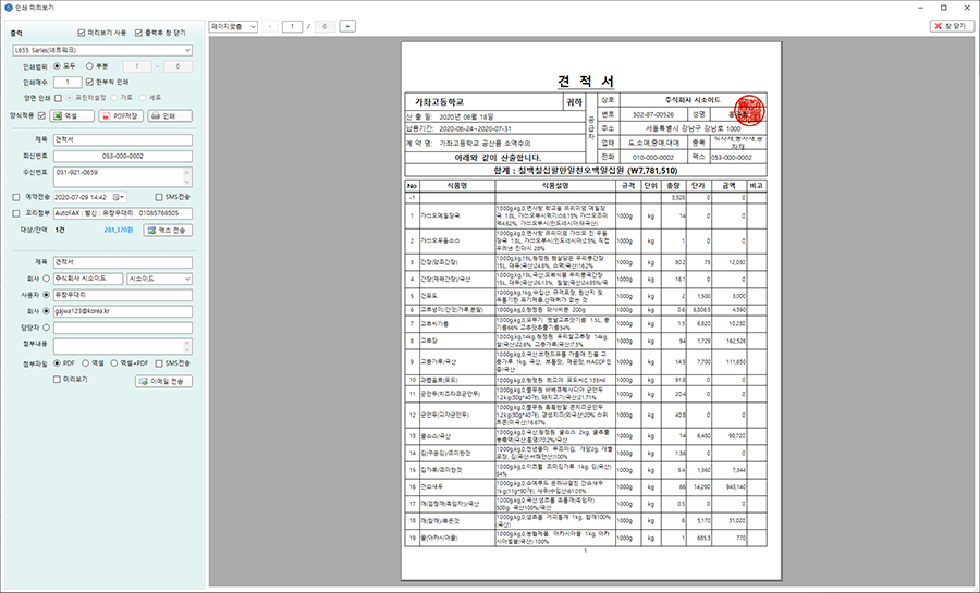 출력시 엑셀 저장 및 이메일, 팩스 전송이 가능