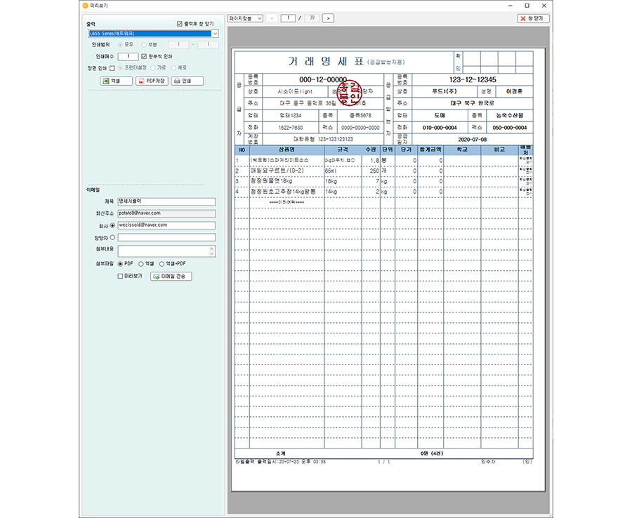 거래명세서를 직접 출력할 수 있습니다.
