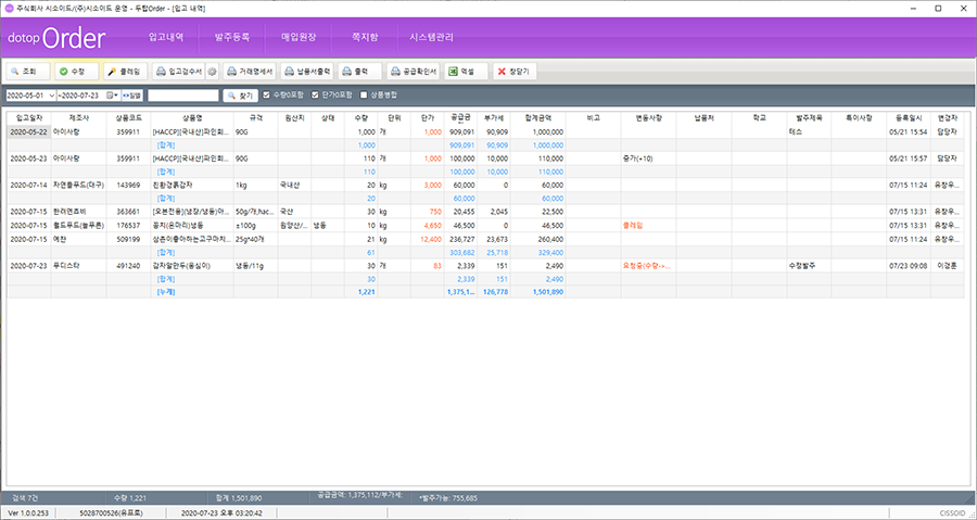 주문의 식재료의 입고 내역을 확인할 수 있습니다.