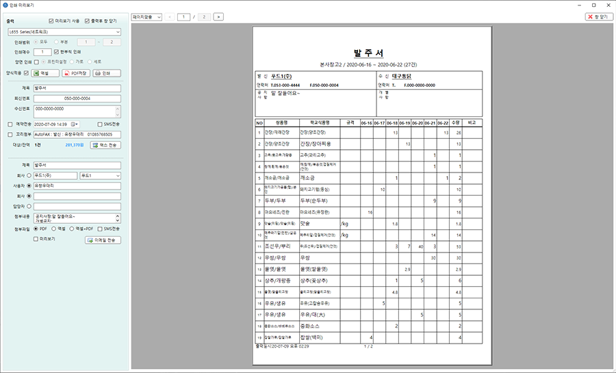 거래처, 상품, 단가, 차량, 친환경, 라벨지, 문자, 팩스, 이메일, 발신번호표시