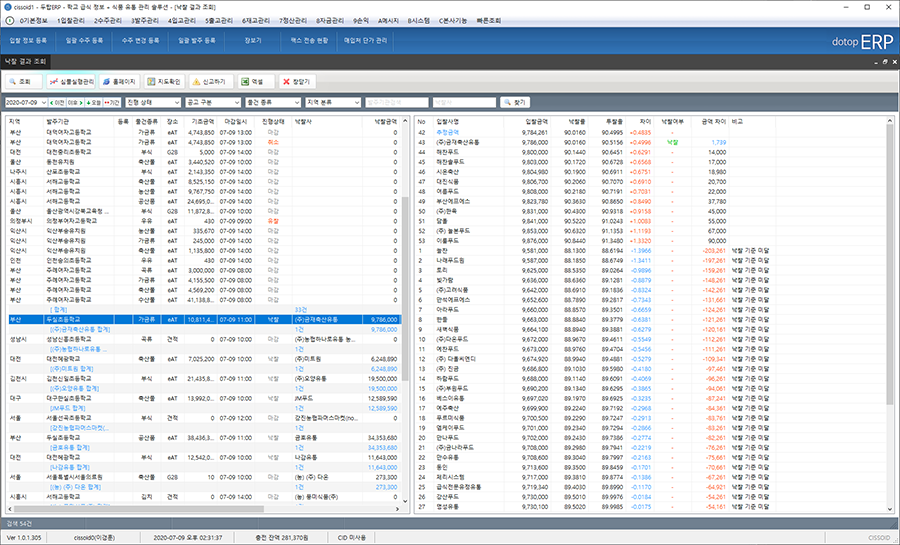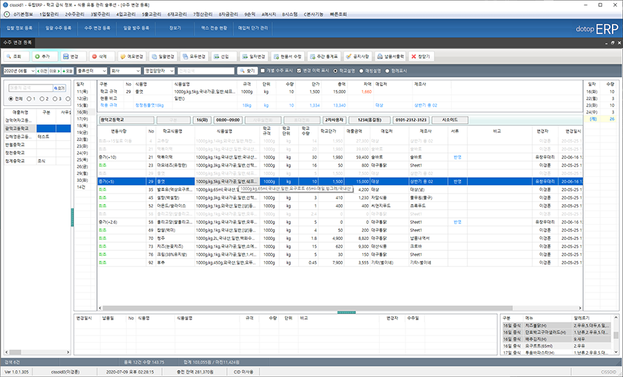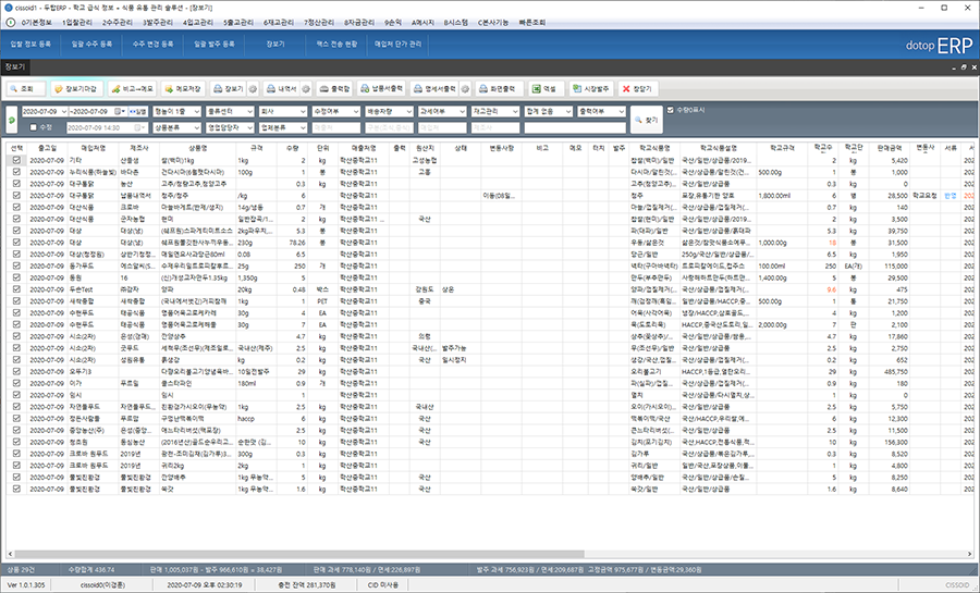 두탑ERP는 식자재 유통 관리에 최적화된 프로그램으로 식품 유통에 필요한 모든 기능을 망라하고 있습니다. 식자재 유통에 필요한 수주, 발주, 입고, 출고에서 재고, 정산 기능으로 안전하게 학교 급식 납품을 도와줍니다. 그밖에도 각종 통계 자료와 팩스, 이메일 전송 및 SMS 메시지 전송도 가능한 토탈 솔루션입니다.